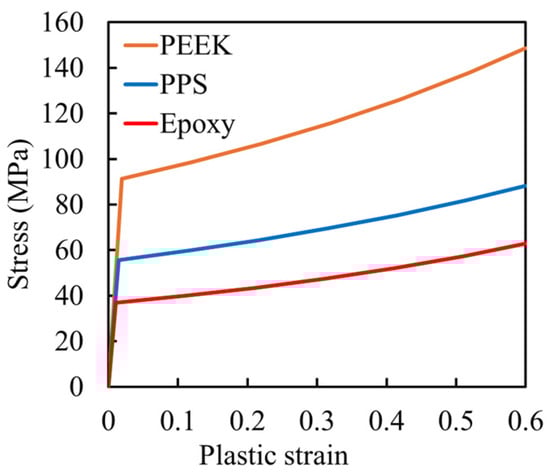 Stress–strain curves representing the plastic behavior of the three adhesive materials (PEEK [35], PPS [36], and epoxy [38]) used in the bonding region of the simulated joints.