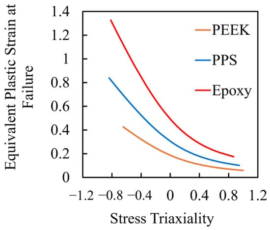 where are the principal stresses, is the tensile strength, and denotes the tensile and compressive strengths of the adhesive resin, respectively. The first term reflects the contribution of the hydrostatic stress, incorporating the tension–compression asymmetry, while the second term represents a generalized deviatoric stress component based on differences among principal stresses. Failure was assumed to initiate when the left-hand side of the equation reached unity. This formulation enables damage prediction under general multiaxial stress conditions. As illustrated in Figure 3, damage was assumed to occur when the equivalent plastic strain exceeded a critical value corresponding to the given stress triaxiality. Stress triaxiality is defined as the ratio of hydrostatic stress to equivalent von Mises stress, and is often used to characterize the stress state at a point. High triaxiality reflects a stress state that tends to suppress plastic deformation, thereby promoting a brittle material response, even in adhesives that are normally ductile. In contrast, low triaxiality corresponds to a shear-dominated condition that allows for more ductile behavior. The failure condition was applied exclusively to the adhesive layer, cohesive failure was assumed, and the adherends and interfaces were assumed to remain undamaged.