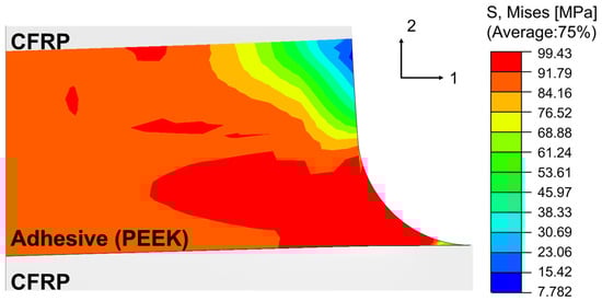 Von Mises stress distribution near the joint edge at the time of predicted damage initiation for a unidirectional CFRP joint bonded with 0.2 mm of PEEK adhesive.