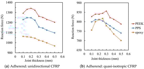 Dependence of adhesive thickness on the reaction force at failure: (a) Unidirectional CFRP adherends showing failure characteristics; (b) Quasi-isotropic CFRP adherends with comparable behavior.
