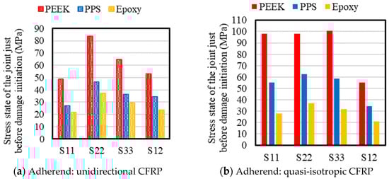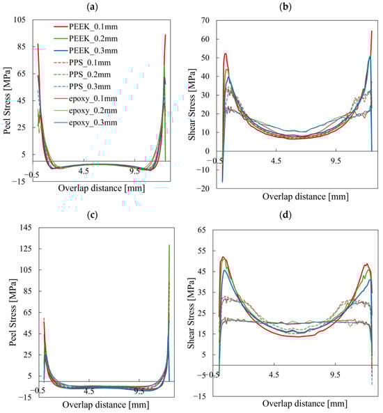 To better understand the mechanisms leading to failure, we examined the stress distribution immediately before damage initiation for the representative case with 0.2 mm adhesive thickness (Figure 6). Here, S11 represents the tensile stress in the longitudinal direction, S22 represents the stress in the peel direction, S33 represents the stress in the width direction, and S12 represents the shear stress in the test direction. Across all cases, failure was induced by a combination of stress components, with peel stress (S22) being more influential than shear stress (S12) at the failure initiation site. This highlights the influence of bending-induced rotation at the overlap ends, which causes a non-uniform stress distribution and generates significant peel (normal) and tensile stresses in addition to shear, leading to a highly non-uniform stress state. The severity of this peel stress increases with adhesive thickness, as thicker bondlines introduce larger axial offset between adherends. This, in turn, amplifies the bending moment and associated rotation at the overlap ends, resulting in elevated peel stress concentrations. Consequently, the fracture initiation point is subjected not to a pure shear condition, but rather to a complex, multiaxial stress state, particularly in joints with thick adhesives or comparable stiffness between adherends. These findings underscore the inadequacy of estimating joint strength by simply dividing reaction force by the nominal adhesive area and further emphasize the need for numerical simulation to accurately resolve local stress distributions. To validate these insights, the stress state near the adhesive edge was extracted from cohesive elements for the same case (PEEK adhesive, 0.2 mm thickness, UD adherends), as shown in Figure 7. The horizontal axis represents the overlap distance along the x-direction as defined in Figure 1, with the origin (0) corresponding to the end of the overlap where the x-coordinate takes its minimum value. Shear1 represents shear stress in the loading direction while Shear2 denotes shear stress along the specimen width. As supported by prior studies [14,17,42], the high localized stresses observed at the edge are closely tied to failure initiation. These results further highlight the importance of controlling adhesive thickness in practical applications.