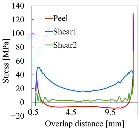 Stress states across the overlap distance in the adhesive layer. Stress concentrations near the adhesive edges are evident, with peel stress being dominant, leading to damage initiation. Shear1 represents shear stress in the direction of applied displacement, while Shear2 indicates the shear stress in the width direction of the specimen. The presented results correspond to the configuration using PEEK adhesive with a thickness of 0.2 mm and unidirectional CFRP adherends. The horizontal axis represents the overlap distance along the x-direction as defined in Figure 1, with the origin (0) corresponding to the end of the overlap where the x-coordinate takes its minimum value.