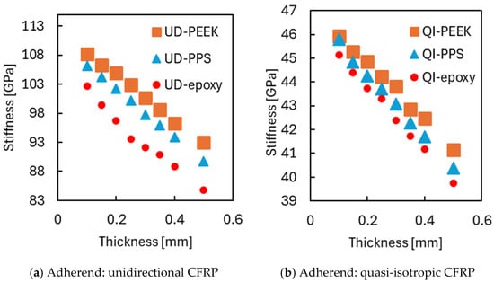 In addition to strength, the joint’s overall mechanical response was evaluated through global stiffness, calculated from the slope of the initial linear portion of the stress–strain curve (Figure 9). Here, stress was defined as the reaction force measured at the end of the joint divided by the cross-sectional area of the adherend at the loaded end, and strain was defined as the overall displacement of the joint divided by its total length. Regardless of adhesive type or layup configuration, stiffness decreased as adhesive thickness increased. This trend reflects the enhanced deformability of the adhesive layer, which becomes more dominant in the joint’s mechanical response as it thickens. Even for stiffer adhesives like PEEK, this effect is evident, indicating that geometric factors can override material stiffness. These observations suggest that while extremely thin layers may raise strength concerns, thinner adhesives are generally recommended for preserving global stiffness.