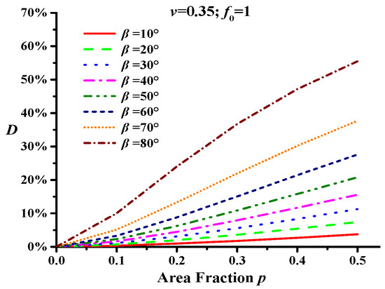Figure 2 shows that the changes in the main crack configuration result in an increase in the modulus damage variable D, implying a reduction in the effective modulus of asphalt concrete. Under the same crack deflection angle β, the modulus damage variable D gradually increases with increasing crack length (i.e., the area fraction p increases), and the increasing trend becomes evident when β exceeds 30°. For the same crack length, D evidently increases with an increase in β, and the crack deflection angle has a more evident influence on the modulus damage variable than the crack length. The results shown in Figure 2 indicate that the crack deflection angle β significantly influences the modulus damage of the asphalt concrete.