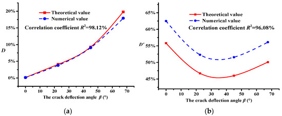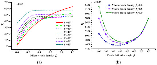 When β = 10°, the modulus damage variable D′ increases significantly with the increase in the micro-crack density (see Figure 3a). This is because the angle between the crack deflection and the direction of the load is small, resulting in a small interaction between the macro-crack and the micro-crack. This makes it difficult to produce the crack toughening effect.