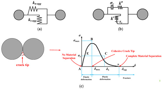 Mechanical contact models for asphalt concrete. (a) Linear model between aggregate particles. (b) Parallel-bond model between asphalt mortar particles. (c) Cohesive zone model between aggregate and asphalt mortar particles.