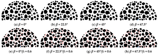 The results shown in Figure 3a indicate that when β is above 10°, the change in the modulus damage variable D′ gradually stabilizes with increasing micro-crack density. When the micro-crack density is below 0.6 (f2 < 0.6), with an increase in β, the modulus damage variable D′ also increases; otherwise, under a high micro-crack density (1.0 ≥ f2 ≥ 0.6), D′ first decreases and then increases (see Figure 3b). This indicates that micro-cracks with a low density lead to an expansion of the damage zone at the main crack tip, which aggravates the modulus damage of the asphalt concrete, whereas high-density micro-cracks inhibit this expansion, thereby reducing the modulus damage of the asphalt concrete, i.e., the micro-cracks exhibit a toughening effect.