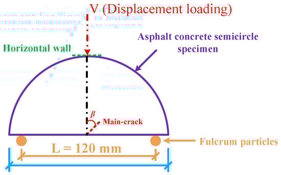The virtual SCB test was conducted through the PFC2D, as shown in Figure 6. Two immovable rigid spherical particles were set at the lower part of the specimen as fulcrums, separated by a distance of 120 mm; a horizontal wall was set on the upper part of the specimen to simulate the indenter in the universal testing machine (UTM) test system (the length of the horizontal wall was the same as that of the indenter). In addition, a constant displacement loading of 1 mm/min was applied to prevent the rapid propagation of the main crack caused by the excessive loading rate.
