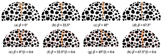 Previous numerical simulation and experimental results [46] indicate that the numerical simulation is accurate. In PFC2D, the generation of cracks mainly depends on the breakage of the force chain at the particle contact interface. If the force chain between particles undergoes normal fracture, an I-mode crack is produced. If the force chain between particles undergoes tangential fracture, a II-mode crack is produced. Figure 7 shows the virtual SCB test results, where the orange line represents the macro-crack.