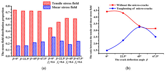 Figure 9 shows that as the crack deflection angle β increases, there are no significant changes in the stress field distribution in asphalt concrete without the influence of the micro-cracks. An increase in β causes a decrease in the tensile stress field distribution and an increase in the shear stress field, resulting in a decrease in the ratio between the tensile and shear stress fields (see Figure 10). This shows that without the influence of the micro-cracks, the fracture mode of the asphalt concrete gradually changes from mode-I fracture (mainly tensile fracture) to mode-II fracture (mainly shear fracture).
