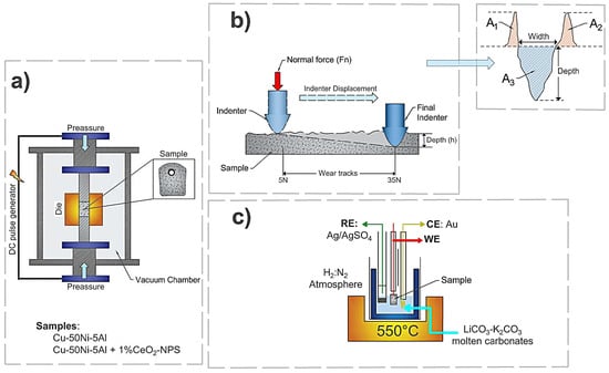 The 1% CeO2 nanoparticles (CeO2-NPs) were incorporated in Cu-50Ni-5Al in a mixed Y–type Astecma for 1 h. Subsequently, Cu-50Ni-5Al samples without and with CeO2-NPs were consolidated by Spark Plasma Sintering (SPS) using a Fuji Electronic Industrial Co. model DR SINTER SPS1050 (Tsurugashima, Japan), according to the procedure previously described by Martínez et al. []. The samples obtained have a 16 ± 0.8% porosity for Cu-50Ni-5Al and 1.0 ± 0.3% for Cu-50Ni-5Al + 1 wt.% CeO2-NPs; and the hardness values of 0% CeO2–NPs is 205 ± 21 HV0.3 and 1% CeO2–NPs is 340 ± 37 HV0.3 [].