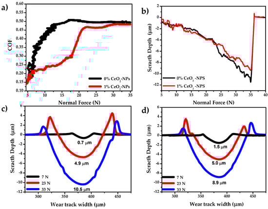 (a) COF vs. normal Force, (b) normal force vs. scratch depth, and the wear tracks profile (c) 0% CeO2–NPs, and (d) 1% CeO2-NPs.