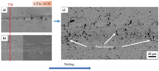 Figure 3 shows SEM images of both samples between 6.5 to 10 N of applied load. Generally, during the indenter passage, most of the material appears to sink to the bottom of the tracks, and a small amount shifts to the edges, forming the pile-up. This micro-mechanism is well known in the literature as micro-ploughing []. Figure 3c shows the wear track of the 0% CeO2-NPs sample at higher magnification. The figure shows the presence of pores, in which the loading conditions may tend to cause the closure of surface pores during tip sliding, which influences how the material deforms during the test []. The tendency towards pore closure may explain the differences in the geometric parameters of the wear profile between both samples at 7 N (see Table 1), causing the increase in contact pressure that promoted high plastic deformation around the surface pores. This localized deformation induced the surface pores to collapse instead of moving towards the edges and bottom of the tracks [,].
