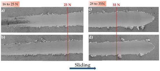 Figure 4 shows the wear path for distinct applied normal force. At 16 to 25 N normal force (Figure 4a,b), the track becomes wider and exhibits more intense plastic deformation within the track. A micro-mechanism transition can be seen from micro-ploughing to micro-cutting, where the accumulation of material on the edges generates the formation of chips as the normal load increases. This micro-mechanism of transition from mild to severe abrasion often occurs similarly in both materials. The transition is attributed to the fact that in ductile materials, it is common to find chips that do not detach from the surface and remain near the edge of the track [], as seen in both SEM images, which supports the findings presented in Table 1.