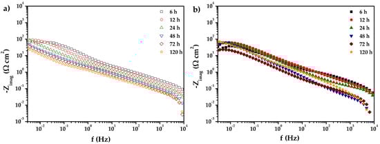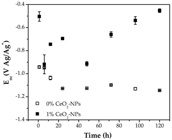 The incorporation of 1% CeO2-NPs decreases the resistance to polarization, which is observed in a less capacitive arc at all exposure times; this may be associated with the protective properties of the oxide layer formed on the surface, such as its poor adhesion and heterogeneity []. It should be noted that at 120 h, the 1% CeO2-NPs sample presents better behavior than the 0% CeO2-NPs sample. This can be attributed to the difference in the corrosion products formed between the two systems, which reduces electrochemical activity and cell performance.