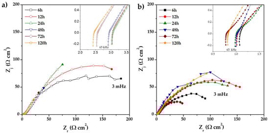Figure 6 shows the Nyquist diagrams of 0% CeO2-NPs and 1% CeO2-NPs samples after 120 h of exposure to Li2CO3-K2CO3 in a H2 atmosphere at E = EOC and 550 °C. The impedance analysis reveals a capacitive behavior of the alloys, independent of CeO2-NPs, indicating a higher resistance to polarization as a function of increased exposure time for both samples, attributed to the formation of protective oxides []. Concerning the effect of temperature on the reaction rate, the anodic reaction has positive activation energies [], indicating that the oxidation of H2 is facilitated at higher temperatures. The heat of the reaction for the gaseous dissolution of H2 and CO2 in carbonates also has positive values []. Therefore, a higher temperature increases the rate of gas dissolution.