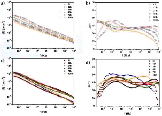 Figure 7 shows the Bode diagrams of 0% CeO2-NPs and 1% CeO2-NPs samples after 120 h of exposure to Li2CO3-K2CO3 in an atmosphere of H2 at E = EOC and 550 °C. The modulus impedance diagrams did not reveal significant differences in the LF range when CeO2-NPs were added. Note that in the sample with nanoparticles, the low-frequency impedance module decreases to 56.5 Ω cm2 after 72 h of exposure and then increases to 120.7 Ω cm2 after 120 h of exposure. This is likely associated with the oxide film cracks and then becomes passivated after 72 h. Figure 7b,d also show the phase angles for both samples. These do not present significant differences but reveal a capacitive response with two- or three-time constants in all frequency ranges, possibly associated with forming an oxide film [].