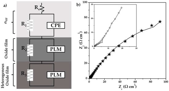 As can be observed from E = EOC, the impedance responses reveal two-time constants in the high- and low-frequency ranges (HF and LF), which can be associated with the cathodic current. This current involves the capacitance of the electric double layer (Cdl) and the formation of an oxide layer due to the dissolution of the alloy, which is related to the surface’s heterogeneity [].