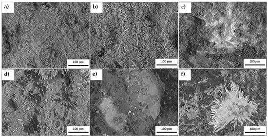 The microstructure of the samples exposed to molten carbonate (Li2CO3-K2CO3 62–38 mol.%) in an H2/N2 atmosphere is presented in Figure 10. Both alloys exhibit a mixed microstructure characterized by filament-shaped particles and a heterogeneous base corresponding to the surface’s aluminum and copper oxides. A significant surface modification was observed in the samples containing CeO2-NPs, leading to an increased formation of cracks and pores and a heterogeneous surface associated with the deposition of molten carbonates in the corrosion products. Additionally, the 1% CeO2-NPs sample exhibits a low presence of pores in the perforated area of the sample (see Figure 10f). Bright areas resembling needle-like structures corresponding to the microstructure of the molten carbonates were also observed.