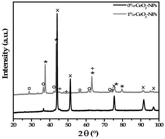 XRD patterns of 0% CeO2-NPs and 1% CeO2–NPs, after exposure to Li2CO3–K2CO3 at 550 °C under an H2/N2 atmosphere. (x) CuNiAl-SS; (□) CeO2; (*) NiO; (o) Cu2O; (+) Al2O3.