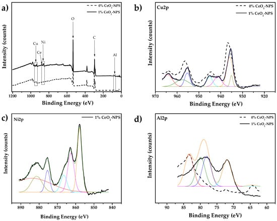 X-ray photoelectron spectroscopy (XPS) analysis (a) full scan spectrum of 0% CeO2-NPs and 1% CeO2–NPs, (b) Cu 2p, (c) Ni 2p, and (d) Al 2p.