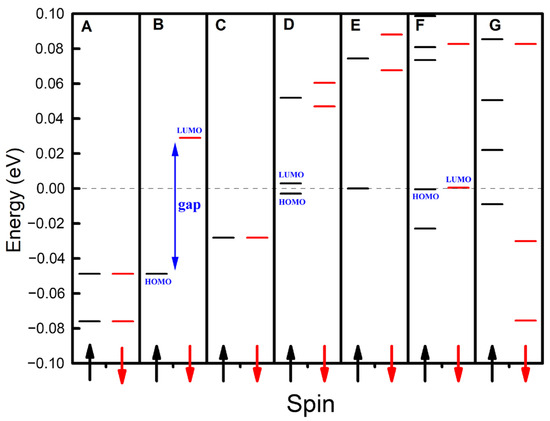 The distributions of the energy levels for the one-dimensional carbon nanomaterials using (5,5) carbon nanotubes. Panels A–G correspond to 0–6 additional electrons, respectively. The dashed line represents the Fermi level, while black energy levels and arrows denote spin-up configurations, and red energy levels and arrows indicate spin-down configurations.
