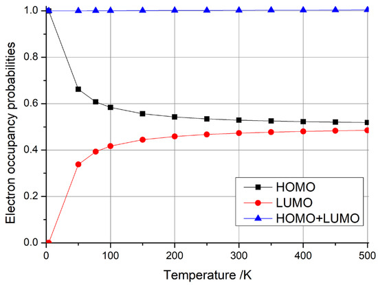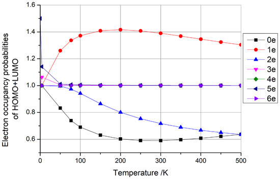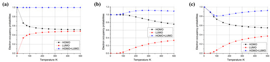 where is Boltzmann’s constant, T is the temperature, is the Fermi energy, E is the energy of an individual level, and is the occupancy probability of the level. Using this formula, we calculated the electron occupancy probabilities of the highest occupied molecular orbital (HOMO) and the lowest unoccupied molecular orbital (LUMO) at different temperatures. We observed three typical distributions for the difference in HOMO + LUMO occupancy probabilities with temperature, as shown in Figure 3, where Figure 3a depicts the case where the occupancy probability of HOMO + LUMO is always equal to 1, Figure 3b shows the case where the occupancy probability of HOMO + LUMO is always greater than 1, and Figure 3c illustrates the case where the occupancy probability of HOMO + LUMO is always less than 1.