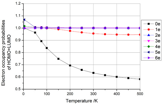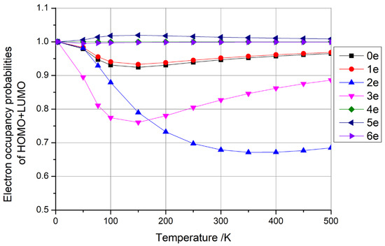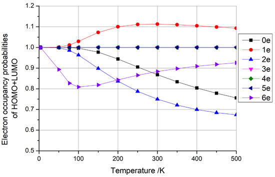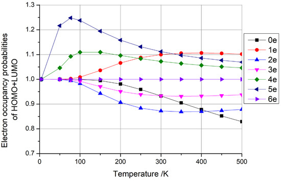 The electron occupancy probabilities of HOMO + LUMO as functions of temperature for one-dimensional carbon nanomaterials comprising (5,5) carbon nanotubes with 0–6 additional electrons, respectively.
