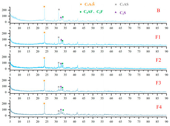 Comparing the strength of samples with different target ferrite-phase contents, it can be observed that as the target ferrite-phase content increases, the overall strength shows a trend of first increasing and then decreasing. This is because, when the ferrite-phase content is within an appropriate range, the presence of the ferrite phase can ensure the development and stability of C4A3Š and C2S during clinkering, maintaining the content of active minerals. The maximum strength improvement is achieved when the target ferrite-phase content is set to 15%, showing a 25.1% increase in 1 d strength and an 11.5% increase in 28 d strength. However, when the ferrite-phase content is too high, the increase in low-activity C2F may negatively affect the strength development of the samples. This study suggests that the reasonable target ferrite-phase range is between 15% and 20%.