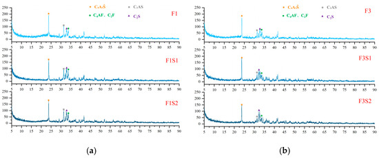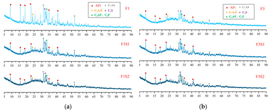 Figure 12 presents the XRD patterns of hydration products at 1 day for samples with a fixed target ferrite-phase content but varying C2S contents. As shown in the figure, increasing the target C2S content appears to have minimal influence on the types and proportions of the hydration products at this early age. This observation is likely attributable to the relatively slow hydration rate of C2S, as indicated by the persistently high diffraction peaks of unreacted C2S visible in the patterns. Furthermore, with increasing target C2S content, the hydration of the C4A3Š phase becomes progressively more complete. Notably, in the F3S2 sample, the diffraction peaks of C4A3Š are almost undetectable. This trend highlights that the early strength development of these CSA-based systems is predominantly driven by the hydration products of C4A3Š, primarily AFt. Conversely, C2S is likely to contribute more significantly to the later-age strength of the material.