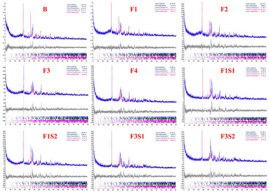 XRD analysis was conducted on cement clinkers prepared under different compositional targets, including varying ferrite-phase contents and varying C2S contents (Figure 2 and Figure 3). Across all samples, the primary mineral phases consistently identified were C4A3Š, C2S, and the ferrite phase, including C4AF and dicalcium ferrite (C2F, Ca2Fe2O5). Additionally, the metastable intermediate phase gehlenite (C2AS, Ca2Al2SiO7), a low-reactivity transitional product, was observed in certain samples. Comparative analysis of diffraction peak intensities confirmed that the experimental mineral assemblages generally aligned with the designed targets. To compare the variations in mineral phases among the groups, quantitative analysis was performed using TOPAS-Academic (Bruker, Ettlingen, Germany). The fitting index (Rwp) for all refinements was controlled to be below 10%. Analysis patterns are shown in Figure 4.