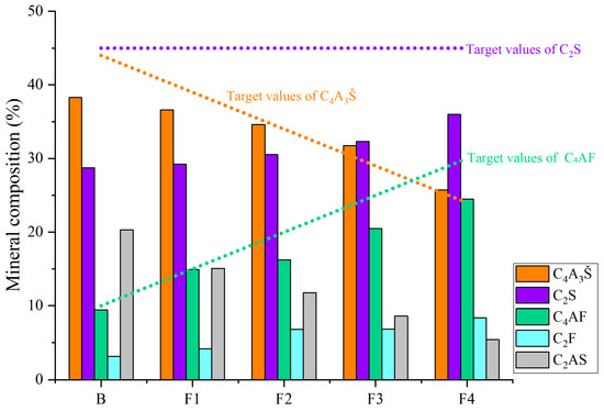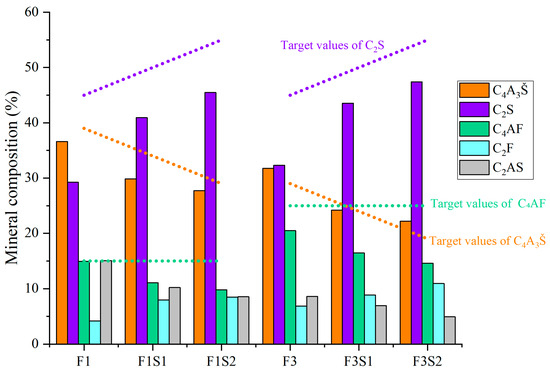 Figure 6 shows mineral composition of cement clinkers under fixed target ferrite-phase content but varying C2S contents. With the target ferrite-phase content fixed, an increase in the target C2S content leads to a significant decrease in the actual amount of C4AF formed in the synthesized clinker, gradually deviating from the initially set target value. Concurrently, this is accompanied by an increased formation of low-activity C2F. This phenomenon suggests that simply increasing the target C2S content can interfere with the normal formation of C4AF, resulting in the formation of the less reactive C2F instead of the more reactive C4AF from the raw materials. Given the hydration activity, an increase in C2F content negatively impacts clinker performance. Therefore, it is crucial to carefully consider the influence of C2S content adjustments on the ferrite-phase composition and to precisely control the target value of C2S during the synthesis process.