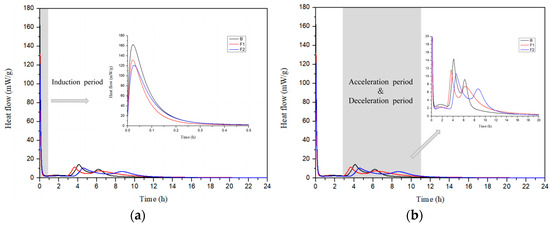 As shown in Figure 7a, the heat flow curve of the samples has three heat release peaks. The first heat release peak is mainly due to the heat released from the dissolution of clinker particles, accompanied by the rapid hydration of a small amount of sulfoaluminate phase in the clinker with gypsum, marking the induction period of cement hydration [42,43]. Comparing the first heat release peaks of different target ferrite contents, it can be observed that as the target ferrite content increases, the first heat release peak decreases. This is because the iron solid solution and iron-alumina phase in the clinker minerals dissolve more slowly compared to the sulfoaluminate phase, resulting in a lower dissolution peak. The induction period for the three samples is similar, all ending within 1 h.