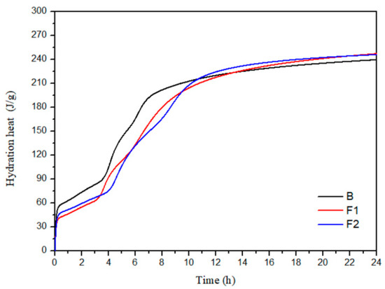 The hydration heat release process of cement samples B, F1, and F2 with different ferrite-phase contents was tested. Figure 7 and Figure 8 show the hydration heat flow curves and cumulative heat release curves of the cement with different target iron phases. From Figure 8, it can be seen that the total heat release of the three groups of samples in this study is relatively close, all around 240 J/g after 1 day.