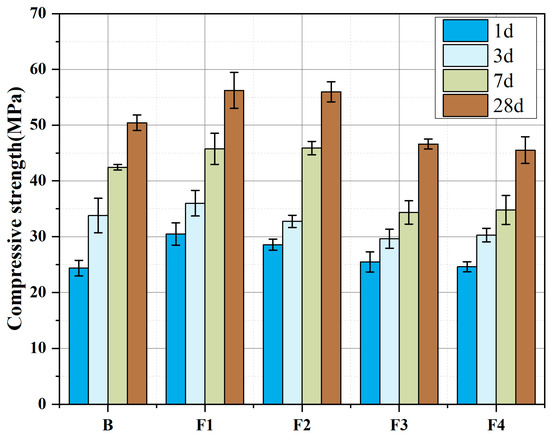 Figure 9 illustrates the compressive strength evolution of cements with varying target ferrite-phase contents at 1 d, 3 d, 7 d, and 28 d. All five groups exhibit excellent early and long-term strength performance, characterized by high early-age strength: 1 d compressive strength exceeds 24.0 MPa (maximum 30.0 MPa). This is attributed to rapid hydration of C4A3Š or ferrite-phase minerals and gypsum, promoting swift ettringite (AFt) formation that reinforces the hardened paste. Long-term strength progressively increases, reaching >50.0 MPa at 28 d, driven by sustained hydration of ferrite phases and C2S.