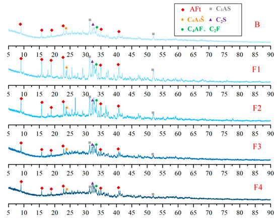 XRD patterns of hydration products at 1 day (Figure 11 and Figure 12) confirm that AFt is the dominant crystalline phase across all samples, consistent with theoretical predictions. Meanwhile, a prominent amorphous halo is consistently observed in the XRD patterns of all samples, indicating the presence of a considerable quantity of non-crystalline or poorly crystalline material. Considering the well-established tendency of Al(OH)3 and Fe(OH)3 to form as amorphous gels during hydration [48], their presence likely contributes significantly to this observed diffuse scattering signal. Additionally, unhydrated clinker phases—such as C4A3Š, C2S, C4AF, C2F and C2AS—were identified, reflecting incomplete hydration at this early stage. Comparative analysis of clinker and hydration product XRD patterns reveals a significant reduction in C4A3Š content, whereas C2AS remains largely unchanged due to its low reactivity. Notably, the AFt content exhibits a non-linear dependence on ferrite content: it initially increases with moderate ferrite elevation (≤20%) but declines at higher levels (>20%). This trend correlates with the reduced C4A3Š content in high-ferrite clinkers, thereby limiting the sulfate–aluminate reaction essential for AFt formation.