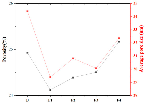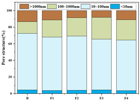 MIP tests were conducted to quantify the porosity, average pore diameter, and pore structure of samples at 1 day hydration (Figure 13 and Figure 14). Results reveal total porosity and average pore diameter initially decrease with increasing target ferrite content but rebound at higher levels (>15%). Notably, the sample with 15% target ferrite content (Group F1) achieves optimal pore refinement, exhibiting the lowest porosity (24.1%) and smallest average pore diameter (29.4 nm). This trend is attributed to the dual role of ferrite phases: (1) moderate target ferrite content (≤15%) enhances micro-aggregate filling effects, refining pore size distribution and reducing connectivity via dense packing of nano-scale C4AF particles; (2) excessive target ferrite content (>15%) impedes early hydration reactions, inducing localized porous structures due to incomplete dissolution of Fe-rich phases and interfacial debonding at boundaries. Concurrently, the proportion of pores >100 nm increases slightly with ferrite elevation, reflecting compromised microstructure homogeneity under high-ferrite conditions.