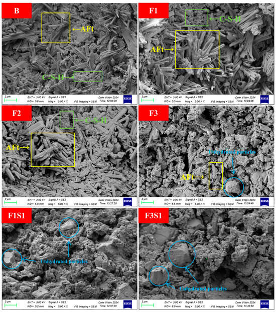 Figure 15 illustrates the SEM microstructural characteristics of samples after 1 day hydration. In experimental groups B, F1, and F3, abundant needle-like or rod-shaped ettringite (AFt) crystals with smooth surfaces, sharp boundaries, and uniform geometric dimensions (length: 1–2 µm; diameter: 0.1–0.3 µm) are clearly observed. These AFt crystals exhibit typical radial or clustered growth patterns, forming an interlocked structure with amorphous or fibrillar calcium silicate hydrate (C-S-H) gel. Specifically, the AFt crystalline framework is embedded within the flocculated C-S-H matrix, collectively constructing a dense early-stage hydration network that contributes to superior initial mechanical strength [49,50]. Notably, the AFt crystals in groups F1 and F3 demonstrate significantly larger dimensions (up to 2.5 µm in length), higher spatial density, and more pronounced clustering compared to group B, suggesting that optimized iron content enhances AFt crystal growth and stabilization.
