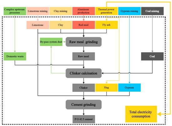 Life cycle inventory analysis is the collation and summary of all inputs and outputs within the system boundary. In this LCA, the consumption of various raw materials and energy sources was derived from actual production data from the cement plant. Pollutant emission data were obtained from real-time monitoring data from the cement plant’s numerical control center and third-party verification reports. Pollutant emission data not included in the monitoring scope were sourced from the CLCD [32] database. Upstream process data for conventional raw materials, solid waste, and energy were obtained from the CLCD [32] database and the related literature [38,39].