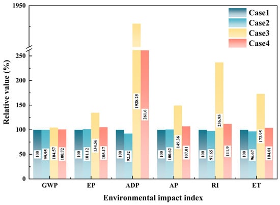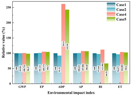 The relative values of environmental impact indexes for Case 2, Case 4, and Case 5 compared to Case 1 are shown in Figure 8.