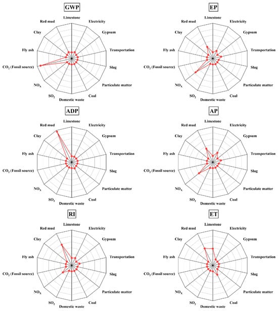 Based on Figure 3, it is evident that red mud exhibits high data sensitivity across various environmental impact indexes. For example, in GWP, the contribution of red mud is second only to the direct CO2 emissions generated during processes such as raw material decarbonization and fuel combustion in cement production. In EP, AP, and RI, the contribution of red mud is second only to the directly emitted nitrogen oxides. This suggests that red mud may be the reason why Cases 3 and 4 fail to generate environmental benefits even when unconventional raw materials are utilized. Specifically, the sensitivity of red mud in ADP reaches a remarkable 95.16%. According to CML2002 [45], this significant sensitivity can be attributed to the fact that the characterization factor for bauxite in ADP calculations is 2.53 × 10−5, whereas the characterization factor for coal is only 3.86 × 10−8. This difference is determined by the total proven reserves of minerals on Earth; compared to bauxite, coal, limestone, and clay have huge reserves, resulting in a lower weight in the ADP accounting system. Furthermore, the production of 1 t of alumina typically requires 2.3 t to 2.5 t of bauxite. The combined effect of significant bauxite consumption and thousands of times higher characteristic factors contributes to such a substantial difference. Similarly, as shown in Figure 4, when compared to cement production, the upstream process of red mud, namely alumina production, is a highly polluting and emissive industrial process. Therefore, from the perspectives of mass allocation or economic allocation, the upstream environmental load of by-product red mud is relatively significant.