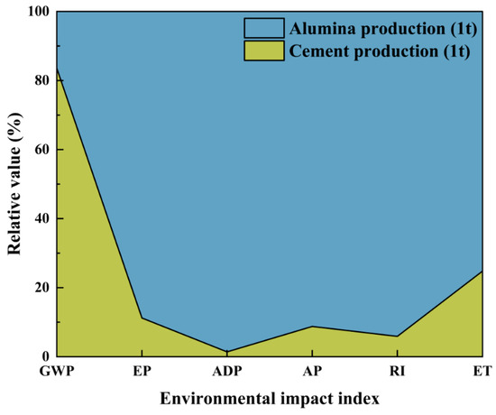 The ratio of the environmental impact of 1 t of cement to the environmental impact of 1 t of alumina (data sourced from CLCD).