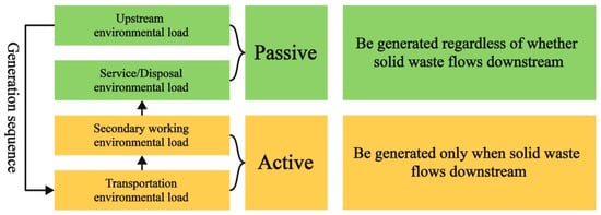 As shown in Figure 6, for solid waste, the environmental load that needs to be accounted for includes the upstream environmental load, service/disposal environmental load, secondary working environmental load, and transportation environmental load. Among them, the service/disposal environmental load refers to the direct environmental load generated by the combustion and decomposition of solid waste in cement production. The secondary working environmental load refers to the environmental load of secondary processes such as grinding and drying after the solid waste enters the cement plant. In addition, both the upstream environmental load and the service/disposal environmental load will be generated regardless of whether the solid waste flows to the downstream process. This is because even if the solid waste does not participate in any downstream production process, it still needs to be disposed of eventually, which is unavoidable and occurs before downstream decision-making. Therefore, they are classified as passive environmental loads. On the other hand, the secondary working environmental load and transportation environmental load are generated only when the solid waste flows to the downstream process, which occurs after downstream decision-making. So, they are classified as active environmental loads.