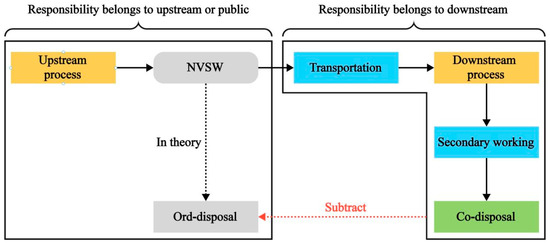 Simultaneously, Roozbeh’s algorithm offers many valuable insights. For example, it deeply reflects the “polluter pays principle” [49,50,51,52], where the generator of solid waste is responsible for its environmental load; this is a relatively fair method. According to the driving force and active/passive environmental load theory, the passive environmental load should be accounted for in the upstream process of solid waste, while the active environmental load should be included in the downstream process. However, similar to Roozbeh’s algorithm, there is also a challenge in practice: it is difficult to individually detect the service/disposal environmental load of a specific raw material. Based on these issues, for NVSW, a new allocation method can be designed: the Collaborative Disposal Allocation Method (CD method).