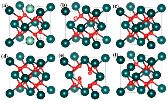 All intrinsic point defects in NpO2 were considered in this study, which include interstitial (Oi, Npi), vacancy (VO, VNp), and antisite atom (ONp, NpO) defects. The defects were created by introducing, removing, or substituting a corresponding atom in the NpO2 supercell, as shown in Figure 1. Considering charge-neutral conditions for defect pair in NpO2, Schottky defect comprises neptunium and oxygen vacancy defects such as m VNp + n VO. Unlike classical 1:2 metal–oxygen vacancy ratios, our DFT+U calculations reveal non-stoichiometric configurations under anoxic conditions. A Frenkel defect consists of vacancy and corresponding interstitial atom, including O-Frenkel (Oi + VO) and Np-Frenkel (Npi + VNp), and formation energy change with vacancy–interstitial separation. An Antisite defect is composed of two types of antisite atoms (ONp and NpO) separated by different distances. Similar non-stoichiometric Schottky defects are observed in CeO2 and PuO2.