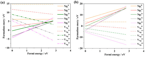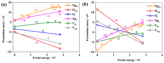 Relationship between point defects and Fermi energy in Np-Frenkel defects, along with formation energies: (a) under anoxic conditions, (b) under oxygen-rich conditions.