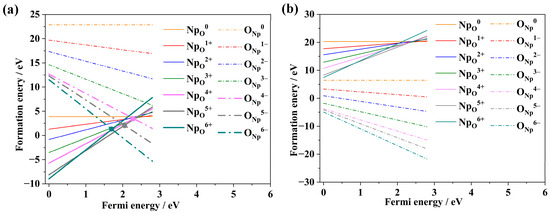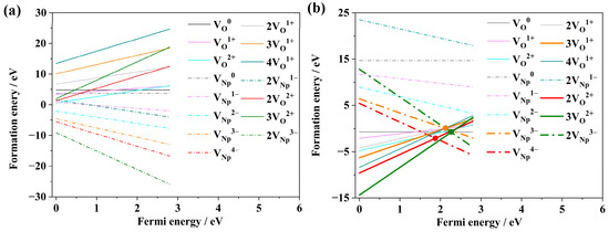 NpO2 is an ionic compound composed of Np4+ and O2−, and its Schottky defects are generally considered to be composed of vacancy defects such as VNp4+ and VO2−. As shown in Figure 3, the relationship between Schottky defect formation energy and Fermi energy in NpO2 is systematically studied in this paper. The results show that the most stable valence states of VNp are mainly +3 and +4. At the same time, although VO+ is not the most stable valence state, its formation energy under anoxic conditions is less than zero, which indicates that VO+ can exist stably. Therefore, in addition to the common Schottky defects (VNp4− + 2VO2+), this paper studies the possibility of other Schottky defects, such as (2VNp3− + 3VO2+) and (VNp4− + 4VO+).