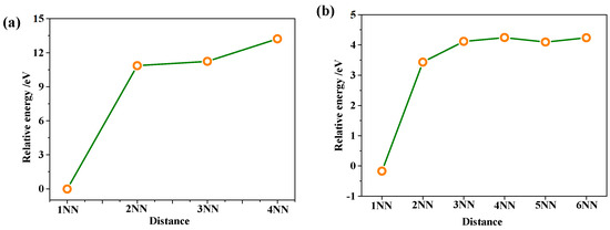 In NpO2, Frenkel defects are composed of pairs such as {Oi: VO} and {Npi: VNp}, and it is widely acknowledged that Frenkel defects in NpO2 typically exist in the form of {Oi2−: VO2+} and {Npi4+: VNp4−}. Given that the distance between the vacancy and interstitial atoms significantly influences the formation energy of Frenkel defects, this study systematically investigates the relationship between Frenkel defects and the interatomic distance to identify the most stable configuration of such defects. The findings indicate that the relative formation energy of Frenkel defects decreases with an increase in the distance between the interstitial atom and the vacancy, as depicted in Figure 4. The Frenkel defect is most stable when the vacancy and interstitial atom are at a distance of 1NN (first nearest neighbor), with the structure illustrated in Figure 5.
