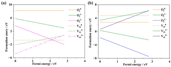 Relationship between point defects and Fermi energy in O-Frenkel defects, along with formation energies: (a) under anoxic conditions, (b) under oxygen-rich conditions.