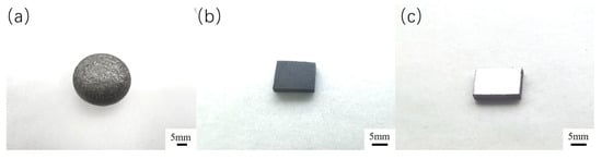 The Fe-20Cr-5B-3Al alloy (Cr: 20 wt.%, B: 5 wt.%, Al: 3 wt.%, Fe: Bal.) was melted in a WF-I-type non-consumable vacuum arc furnace (Henan NBD Technology Co., Ltd., Zhengzhou, China) at a working temperature of approximately 2000 °C. Due to the high tendency of boron to be lost during high-temperature melting, a ferroboron master alloy containing 12 wt.% boron was used as the boron source. To reduce oxygen content, titanium granules were added for deoxidation treatment. In each operation, up to four samples could be melted simultaneously. Titanium granules were first melted for about 4 min to absorb oxygen, followed by the melting of the alloy samples. Each sample was melted for 4 min, repeated twice, then turned over and remelted three more times using a manipulating rod in coordination with a tungsten electrode rod to ensure homogeneity of the alloy composition. A total of eight complete samples were synthesized in this study. Each sample was sectioned from the central part of the alloy and cut into four pieces with dimensions of 14 mm × 7 mm × 2 mm using a DK-7720 electric spark wire cutting machine (Baomade Electromechanical Co., Ltd., Suzhou, China), yielding 32 samples for subsequent experiments. Subsequently, during the polishing process, mechanical grinding was sequentially performed on a PG-2B metallographic pre-grinding machine (Cankang Optical Instrument Co., Ltd., Shanghai, China) using SiC sandpapers with grit sizes of 150, 400, 800, 1000, and 2000. Final polishing was carried out on an LC-250 metallographic polishing machine (Teshi Test Equipment Co., Ltd., Suzhou, China). The polished samples were then ultrasonically cleaned in a JPS-80A cleaner (Youmai Technology Co., Ltd., Shenzhen, China) for two hours to remove surface oils and the surface oxide layer, thereby ensuring the accuracy and consistency of the experimental tests. The samples after melting, cutting, and polishing are shown in Figure 1.